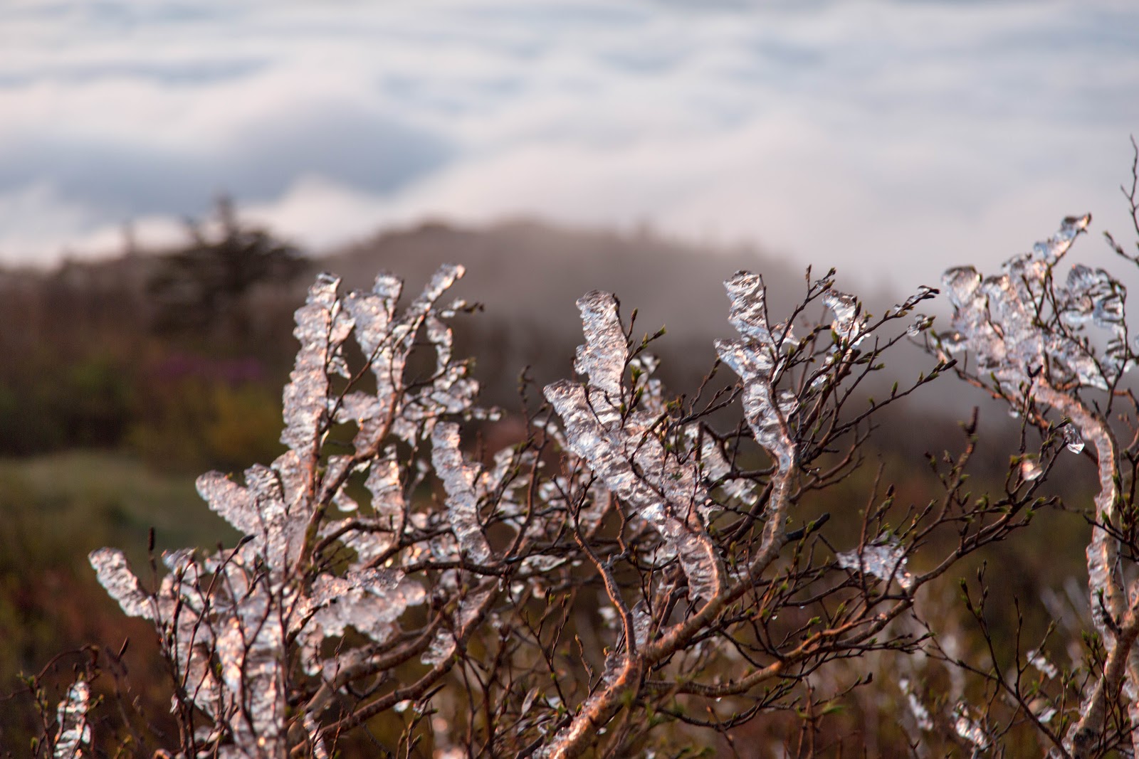 We quickly folded our blankets and return them to the reception table, then walked out to the peak nearby. C was ahead this time. I took my time to take picture of the town seen below. Then I slowly walked up to the peak and enjoyed the pre-sunrise moment. It was cold. The wind was strong. The plants have icicles on them. C was doing time lapse on the rising sun and the flowing clouds. Finally the sun broke through the clouds and shone on us. Many hikers came up from the other side of the trail, we guessed they started hiking in the middle of the night from Osaek.